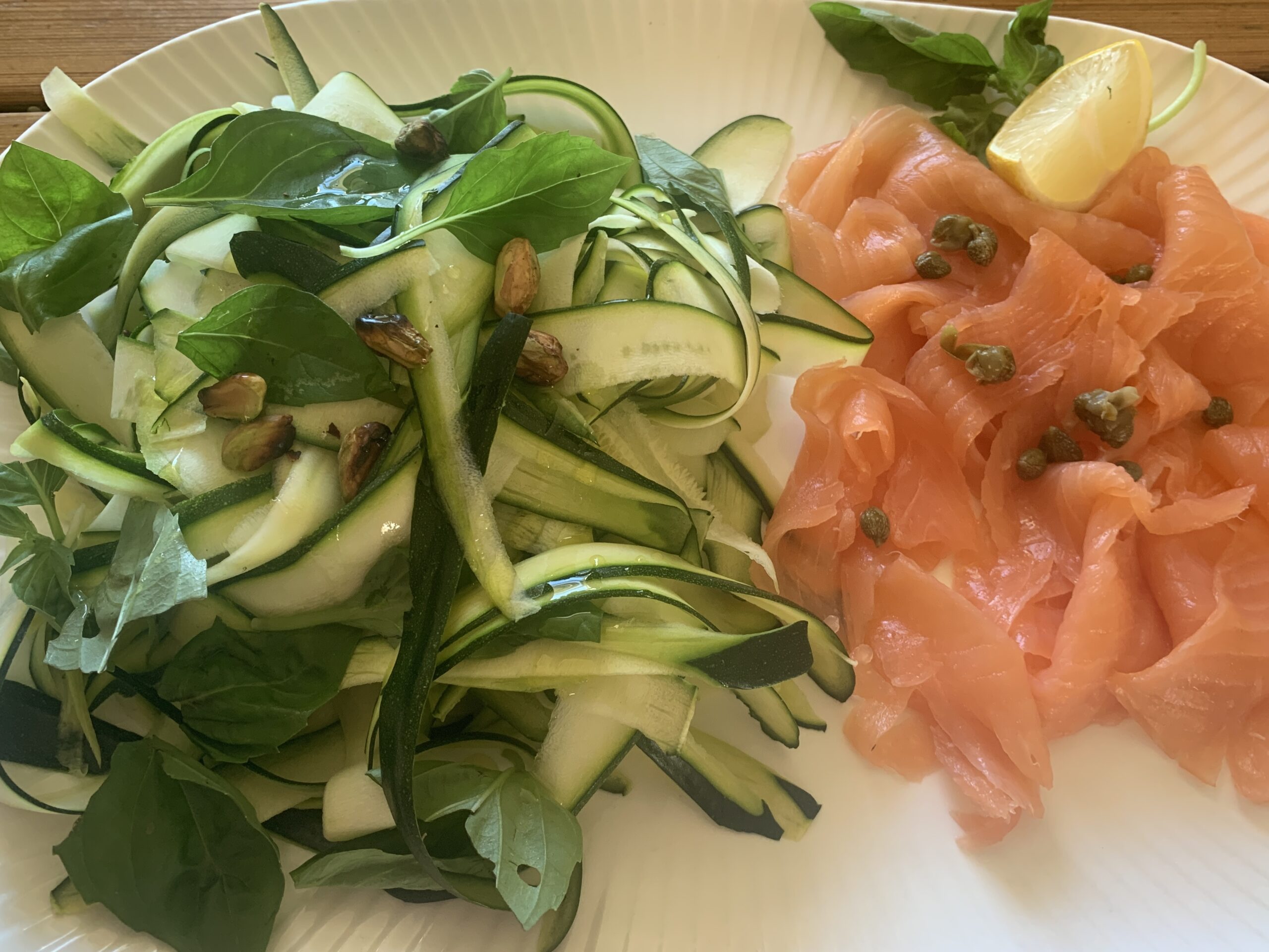 The delicous delicate taste of our Smoked Salmon is complimented so well by the zingy courgette, lemon and parmesan salad.